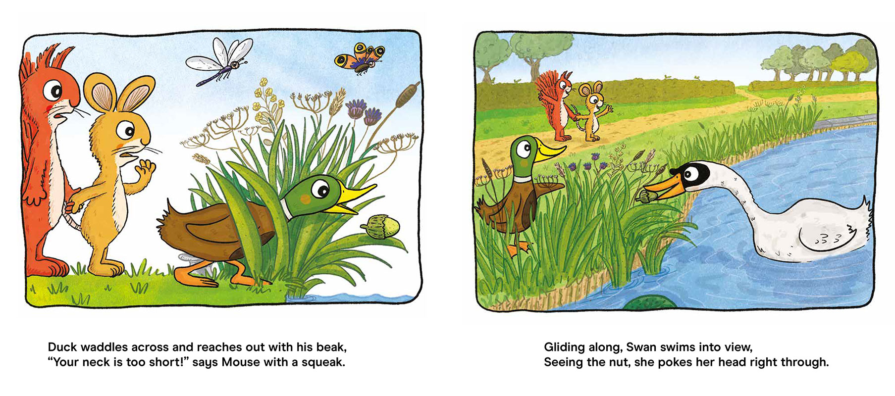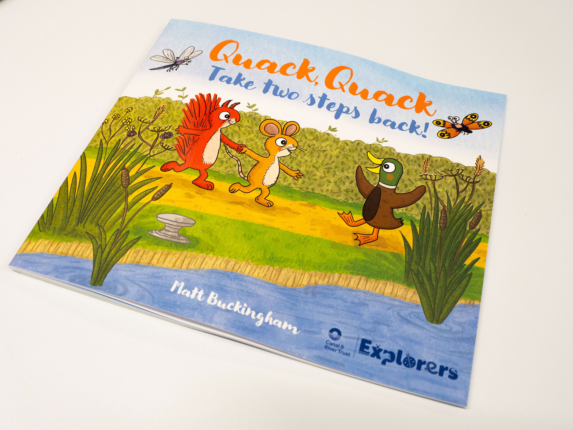 Muddy Publishing and illustrator Matt Buckingham worked with the Canal & River Trust on a vital water safety campaign. We produced a storybook to teach young children about staying safe around canals and rivers. ‘Quack, Quack Take Two Steps Back‘ is created in consultation with parents and carers. The book is designed to take children on an exciting adventure with Squirrel and Mouse and their acorn ball.