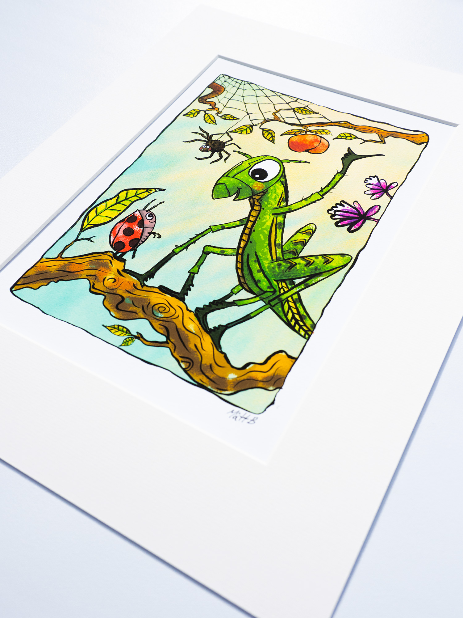 A high-quality reproduction print of original ‘Grasshopper’ artwork by Matt Buckingham. This is a specialist archival giclée print produced on smooth fine art stock 285gsm.