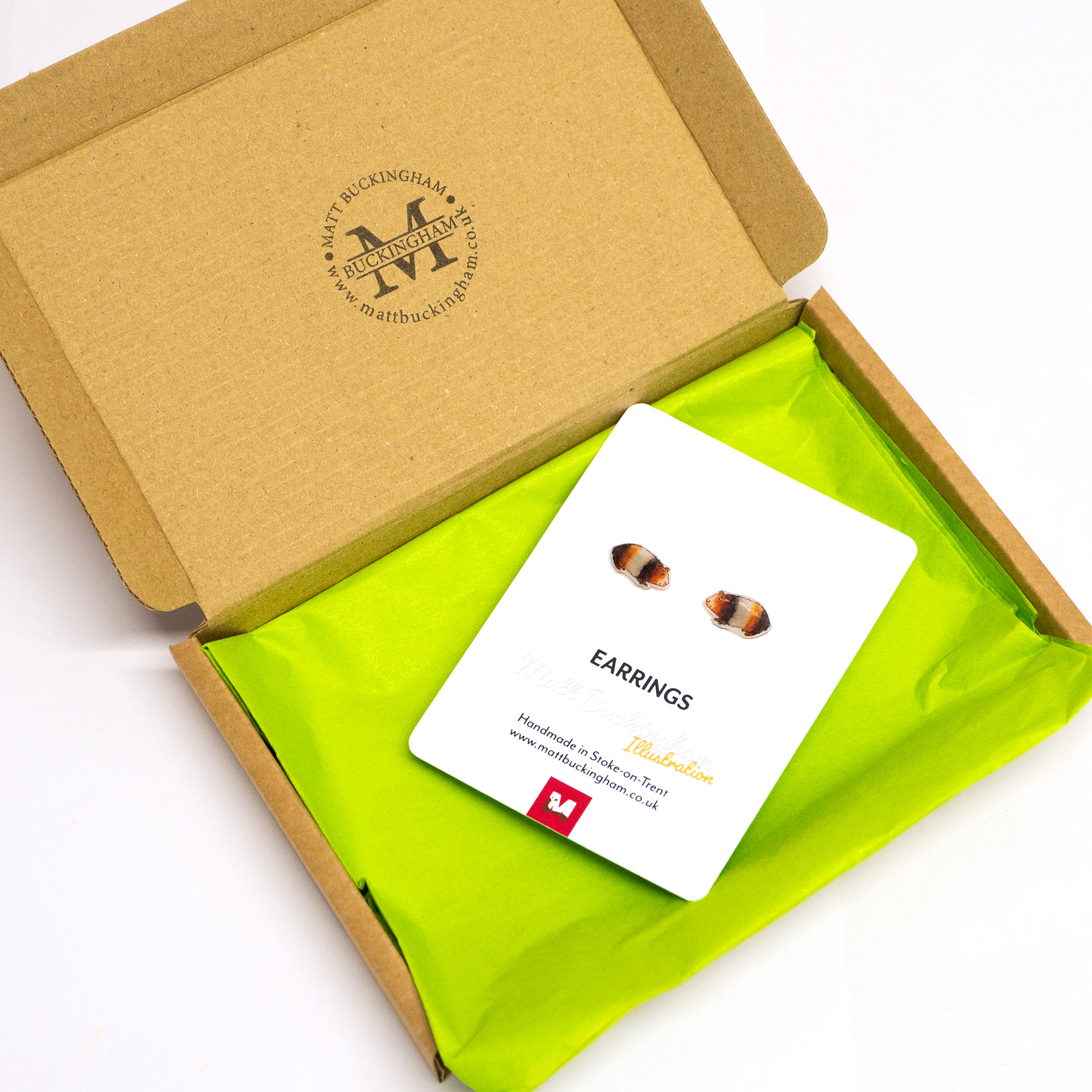 Produced using Matt Buckingham’s original artwork, these unique guinea pig stud earrings have been handcrafted from sheet polymer.